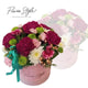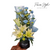 Unique and Elegant Box arrangement of mixed Yellow Lilies, 9 Tinted blue roses, green dendrathemas with blue fillers and foliage.