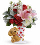This is an arrangement of 3 Red Roses, 3 Pink Carnations, Miniature Carnations, White daisies, Dendrathemas in a clear vase or hand-tied bouquet with a small cute and huggable bear and a small chocolate.