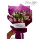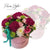A sophisticated look of flowers in a gift box, a combination of lush purple and pink carnations, white and green dendrathemas, berries or other premium fillers and foliage.