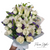 A bouquet of white flowers can be bold and brilliant, or gentle and self-effacing. This is an  elegant hand-tied bouquet of mixed white blooms of 12 White roses and White Lilies with purple fillers, and foliage.