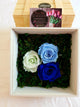 This is a combined 3 large heads of eternal roses with 5-6cm in size per head and with colors Yellow, Orange and Peach. Elegantly arranged in a black square wooden box with green moss.