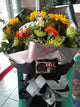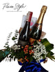 Basket of arrangement of mixed flowers (White Lilies, Pink Gerberas, Red Roses, Yellow and pink daisies/dendranthemas, fillers, and foliage)