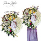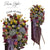 A standee sympathy spray arrangement of lush colors and pastel colors of blooms with premium fillers and foliage, accented with burlap and purple ribbon.