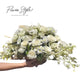 A lovely basket arrangement of White and Blush flowers for all occasions (Lilies, Lisianthus, Carnations, Roses, Japanese Spider mums, Dendrathemas) with fillers and foliage