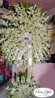 Elegantly arranged with White Orchids, Yellow or White Lilies, White dendrathemas, White anthuriums, fillers and foliage