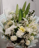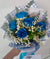 A bouquet of 6 or 12 blue roses, accessorized with greens, fillers, and blue ribbon. These are artificially sprayed/ tinted blue roses